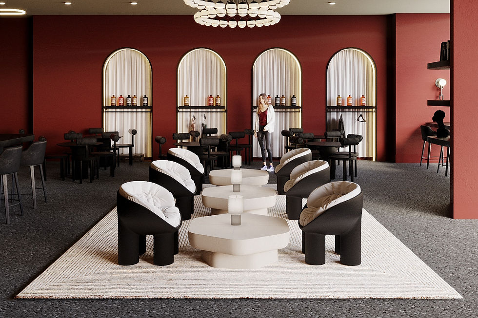 Signature Deep Red Walls: Evoking warmth, passion, and intensity, these walls define the visual DNA of the brand.